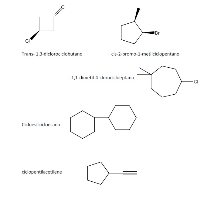 Scrivere le formule di struttura di: trans-1,3-diclorociclobutano; cis-2-bromo-1-metilciclopentano; cicloesilcicloesano; ciclopentilacetilene; 1,1-dimetil-4-clorocicloeptano