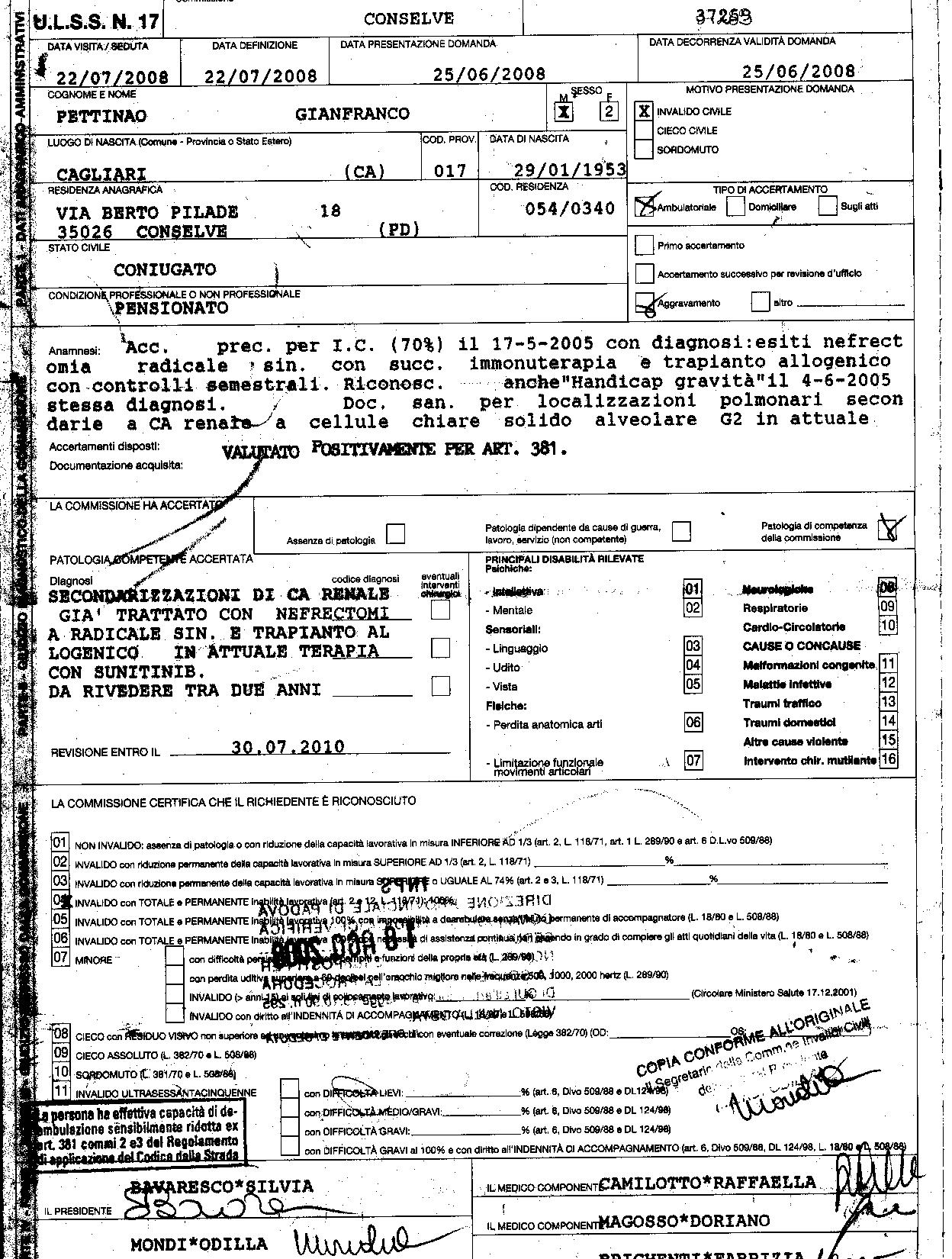 Per quanto riguarda l’invalidità, mi è stato riconosciuto il rigo 4, così si legge: INVALIDO con TOTALE e PERMANENTE inabilità lavorativa (art.2 e 12 legge 118/71): 100% Per quanto riguarda la Legge 104/92, così si legge: PORTATORE DI HANDICAP con grado di invalidità superiore ai 2/3 (ART. 21 L.104/92; Inoltre nella stessa busta mi è pervenuto il cartellino per l’esenzione totale dei tiket COD. IC13. Questo è quanto, ora dovrei ritornare in ASL, per farmi autorizzare a ricevere dai VV.UU (Polizia Municipale) il contrassegno del parcheggio handicap. Ovviamente, spero che un giorno possa restituire all’ASL ( a parte la pensione) tutti quei macabri riconoscimenti! Franco, che dici, hanno fatto le cose giuste, oppure avrei potuto aspirare a qualcosa di più? Secondo mio modo di vedere, penso siano stati rispettati tutti i parametri, però sai, a volte qualcosa può anche sfuggire. Buon week end a tutti quanti. |