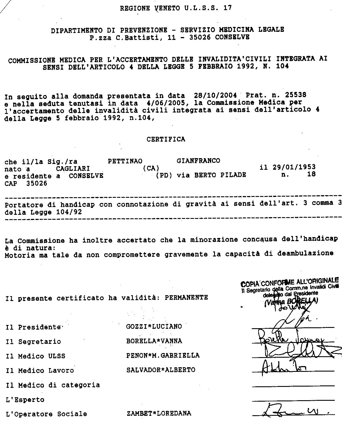 Caro Alberto totalmente invalido... penso che abbiano fatto quanto dovevano per quanto riguarda l'invalidità, un pò meno per quanto riguarda il riconoscimento handicap. Il contrassegno per auto viene rilasciato a chi ha ridotta capacità deambulatoria, cioè a chi è portatore di handicap con connotazione di gravità prevista dal comma 3 art. 3 della legge 104, che a sua volta viene anche richiamato dall'art. 381 del Regolamento CDS che si riferisce a persona che ha effettiva capacità di deambulazione sensibilmente ridotta. In sintesi sul verbale ci dovrebbe essere la dicitura "valutato positivamente per art. 381" o qualcosa di simile. Da quanto capisco penso che i VVUU non accetterenno la tua domanda.... ma tutto a questo mondo è possibile... Vedo se riesco a inviarti le copie dei miei verbali.